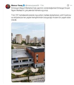 Ankara Büyükşehir Belediye Başkanı Mansur Yavaş, sosyal medya hesaplarından yaptığı açıklamada, “Etimesgut Sosyal Yaşam Merkezi’ni çok yakında hizmete açıyoruz. Kütüphanesi, amfi tiyatrosu ve atölyeleriyle her yaştan hemşehrimizin buluşacağı modern bir yaşam alanı olacak.” ifadelerini kullandı.